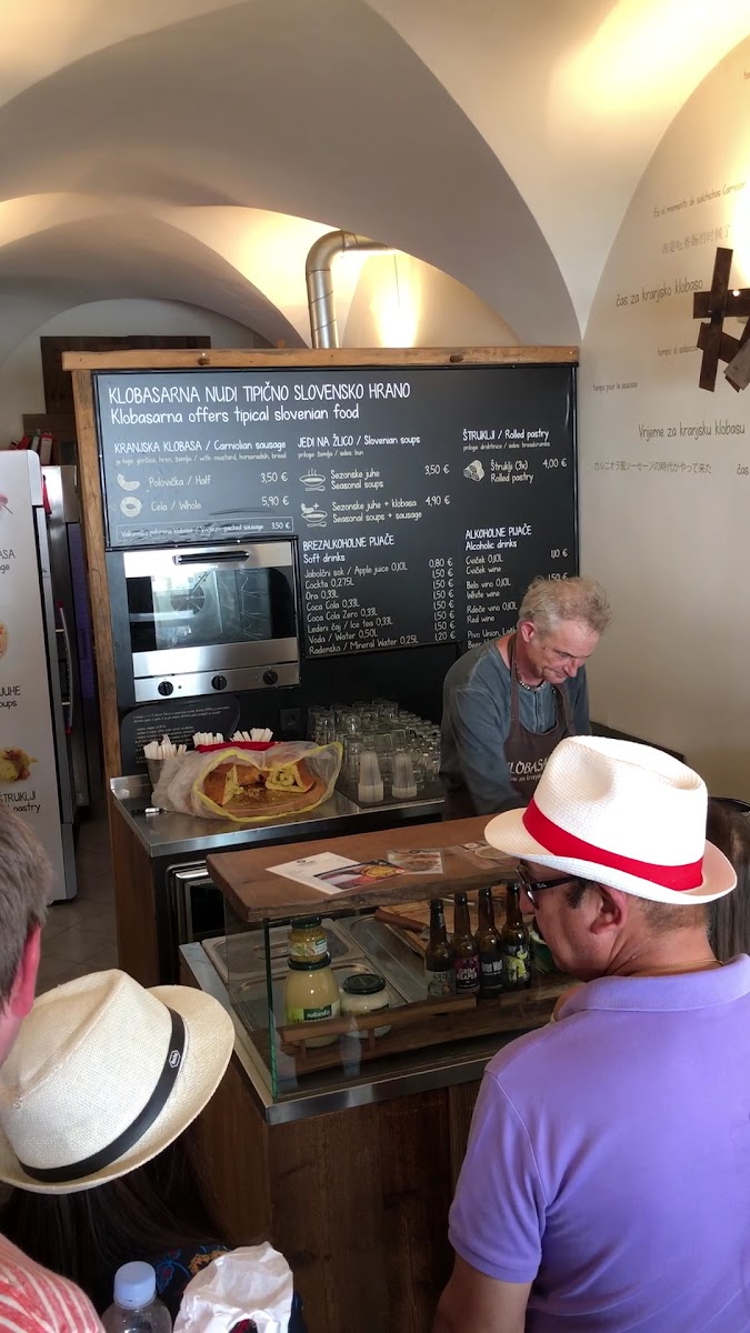 We went to this place after having seen many YouTube videos where they recommended this place. The sausage was really tasty and was served with two pieces of buns, grainy mustard and horseradish dip. The Istrian soup was also nice (I'm guessing it was with sauerkraut). We also tried the štruklji and it was not bad but it's not my kind of food .